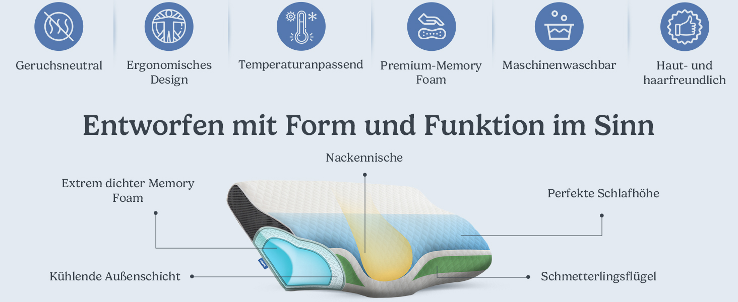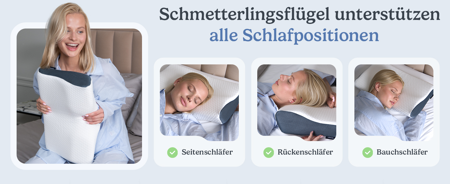 Die innovative Schmetterlingsform des Derila Kontourkissens wurde speziell entwickelt, um hervorragende Unterstützung für ваш Kopf und Nacken zu bieten. Diese ergonomische Gestaltung ermöglicht es Ihnen, schneller einzuschlafen und die Schlafqualität zu verbessern. Egal, ob Sie auf dem Rücken, der Seite oder dem Bauch schlafen, das Derila Kissen passt sich perfekt an Ihre Schlafposition an.