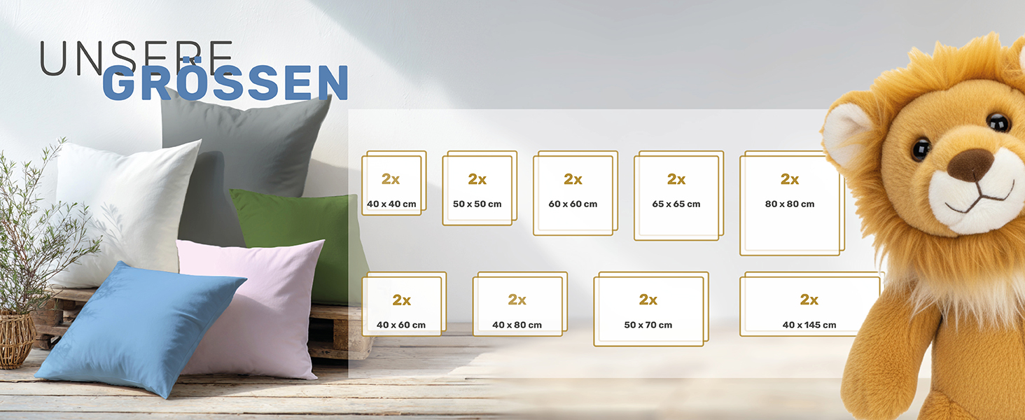 Wir bieten unseren beliebten Kopfkissenbezug im praktischen 2er-Set an, verfügbar in verschiedenen Standardgrößen wie 40×80 cm, 50×50 cm, 40×60 cm und vielen weiteren. Auch spezielle Größen für Seitenschläferkissen, wie 40×145 cm, sind im Sortiment enthalten, um jedem Schlafbedürfnis gerecht zu werden.