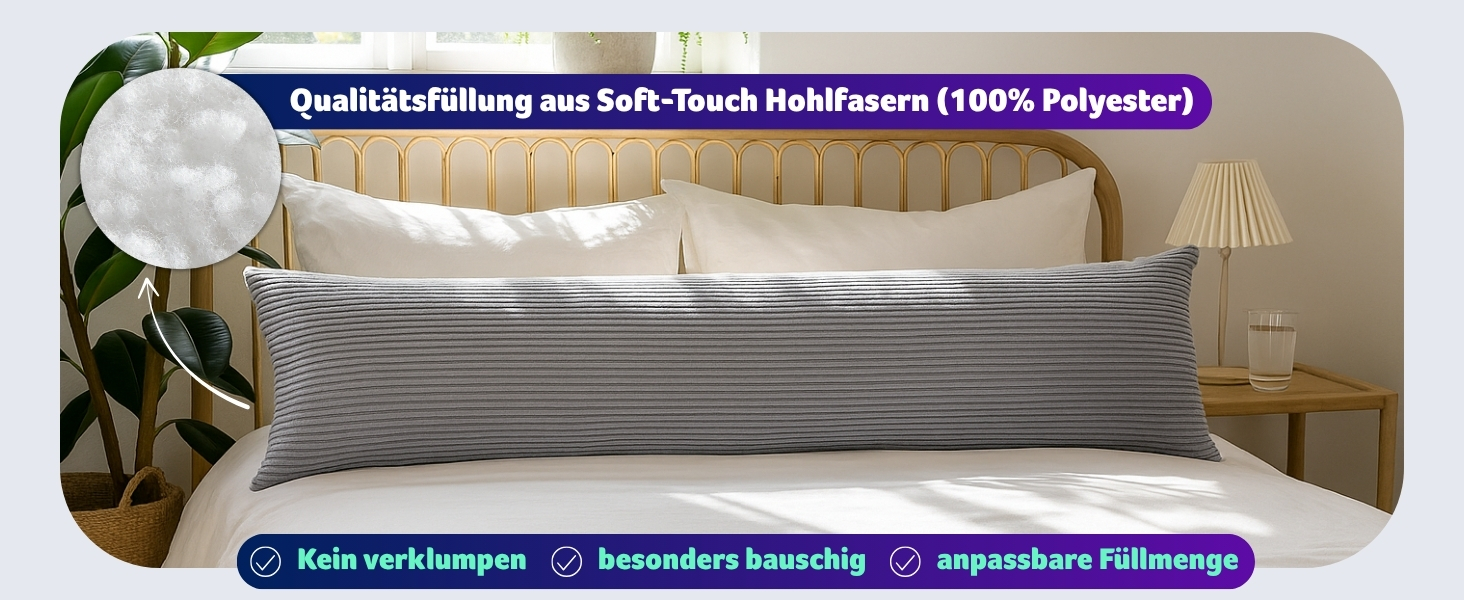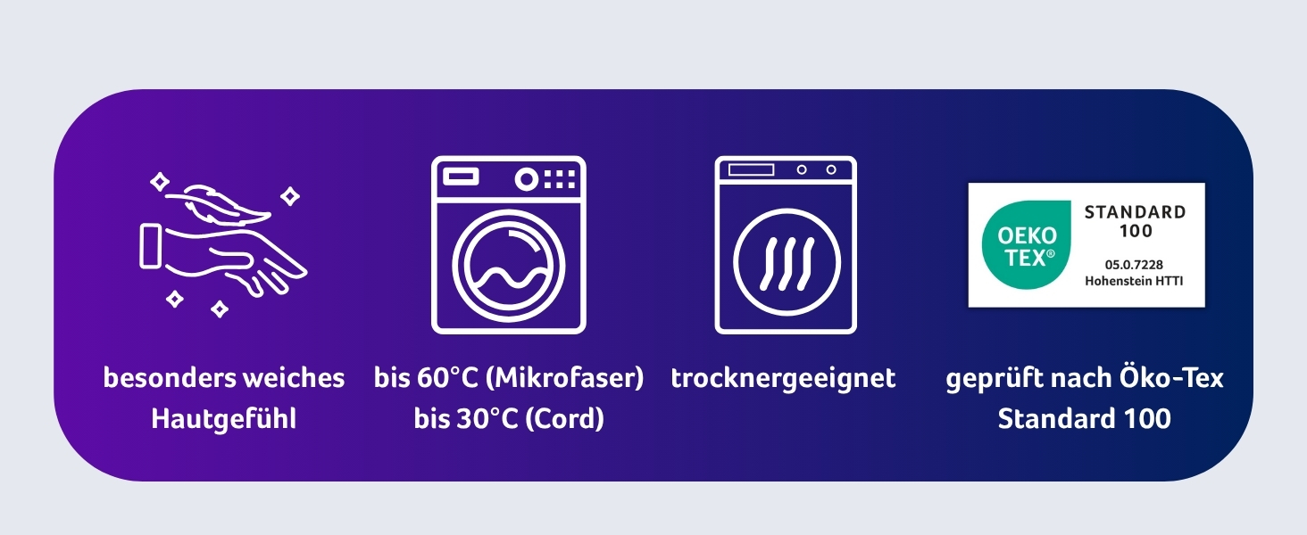 Der Kissenbezug aus weichem Cord (100 % Polyester, 380g/m²) bietet nicht nur einen luxuriösen Griff, sondern auch eine gemütliche Schlafumgebung. Durch die hochwertige Versteppung mit Klimafaser wird ein optimaler Feuchtigkeitstransport gewährleistet, der für ein angenehmes Schlafklima sorgt.